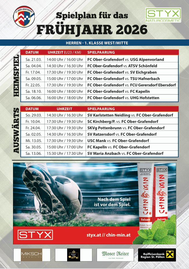 In der neuen Vereinszeitung findet ihr neben Infos über die aktuellen Vereinsaktivitäten auch alle Spieltermine für die Frühjahrssaison. Die Zeitung ist wieder im Spar und Billa Markt Ober-Grafendorf und beim Eingang zur Immocentralarena zur freien Entnahme hinterlegt.